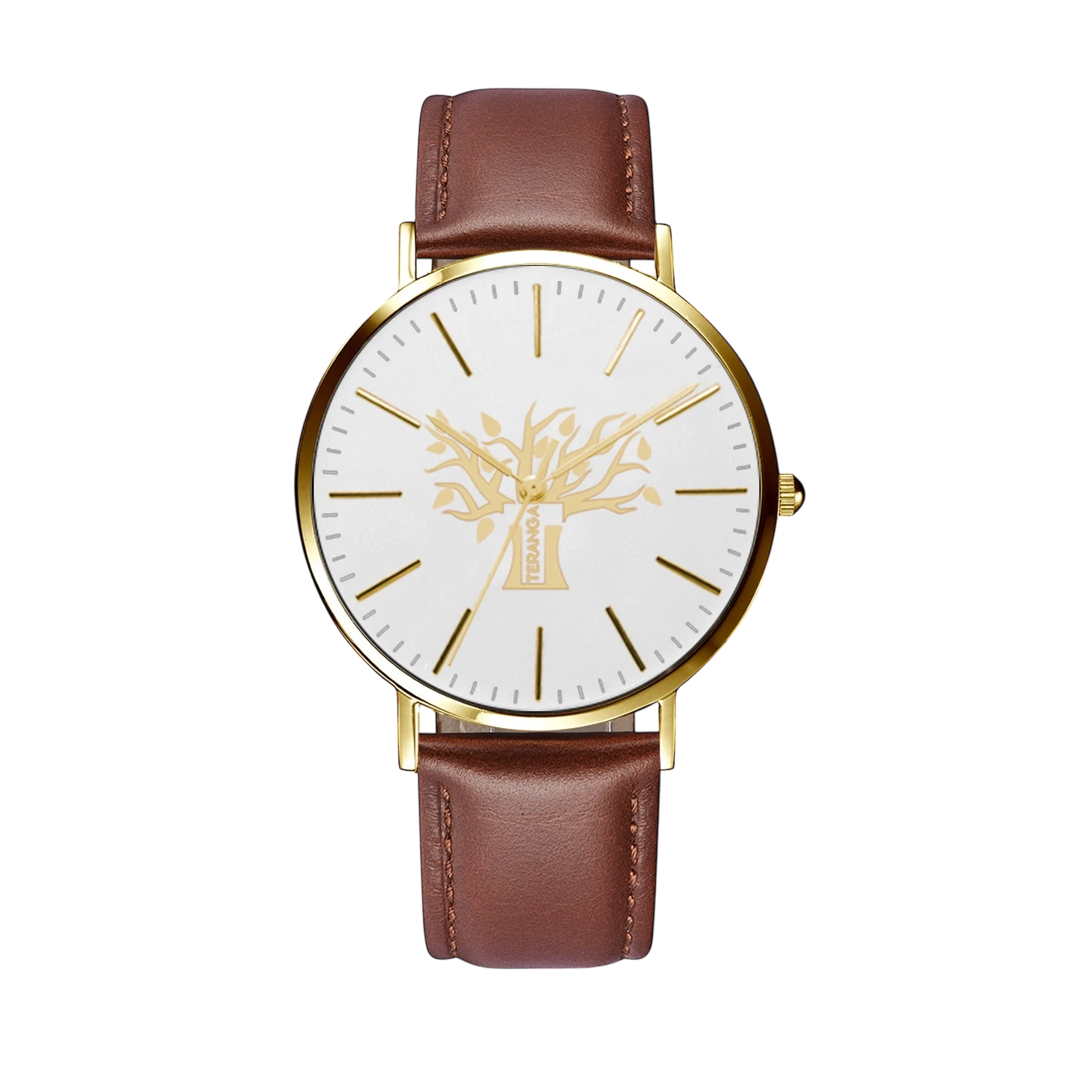 Son contour doré et son fond blanc lumineux, sublimés par un bracelet en cuir marron, en font une montre intemporelle, parfaite pour celles qui apprécient la simplicité raffinée.