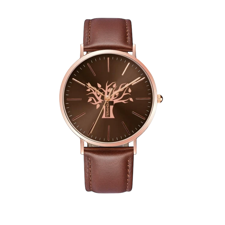 Avec son contour rose gold, son fond marron et son bracelet en cuir assorti, elle célèbre la beauté brute et authentique des terres sauvages.